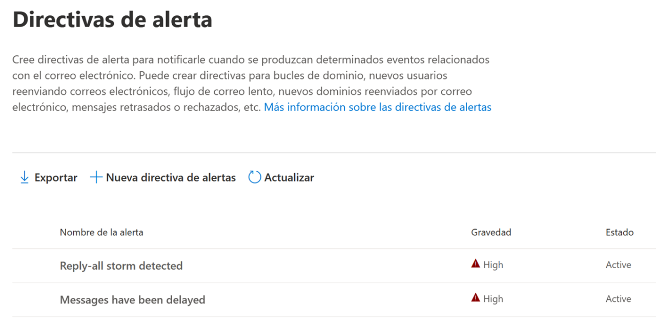 Las Directivas de alerta permiten notificar determinados eventos relacionados con el uso del correo electrónico, algo que no solo ayuda a solucionar problemas con el flujo de correo de la empresa, también proporciona información adicional que puede ayudar a mitigar problemas de seguridad.