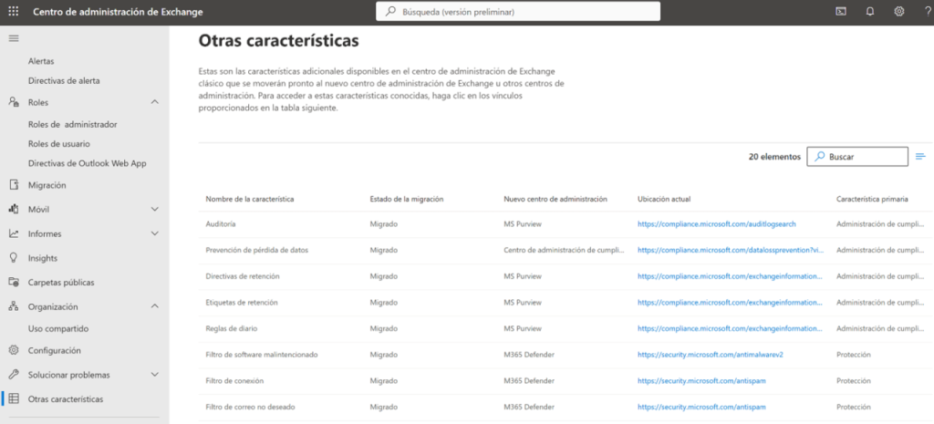 En la siguiente imagen se parecía como muchas funciones relacionadas con el funcionamiento del correo se administran en otras consolas de M365, el inconveniente principal, es que a veces no se revisan estas opciones y se pierde la oportunidad de utilizar servicios muy útiles para mejorar el entorno de trabajo y la seguridad en general.