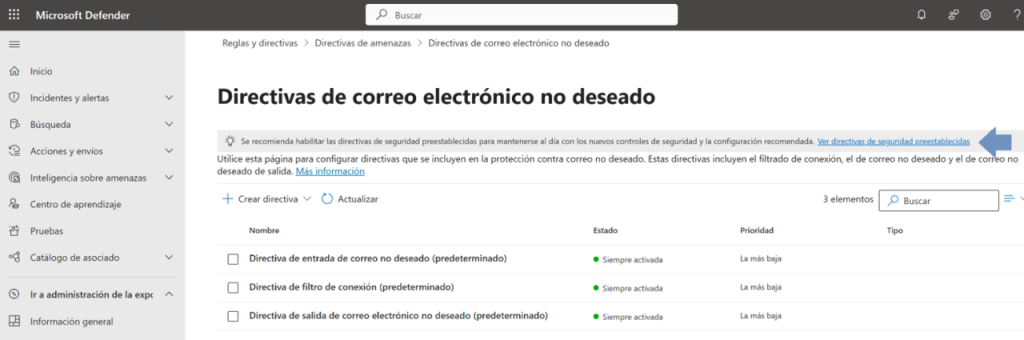 Estos servicios están disponibles en la consola de Microsoft Defender, como directivas de amenazas en directivas de correo no deseado, y Microsoft 365 ya nos proporciona una serie de defensas básicas habilitadas por defecto.