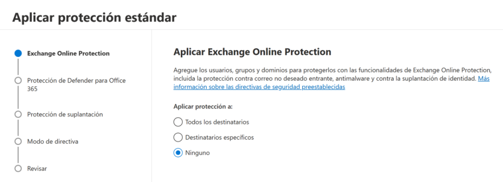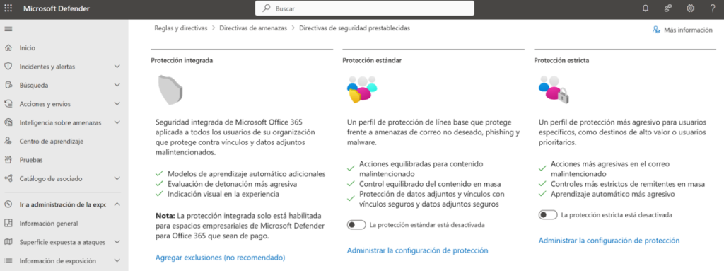 En la siguiente imagen se puede apreciar las opciones disponibles, una característica muy interesante es que Microsoft puede ir añadiendo protecciones adicionales, sin la intervención del administrador, en función de las nuevas amenazas y desafíos de seguridad, lo que simplifica la administración del ciclo de seguridad para proteger los servicios de correo electrónico.
